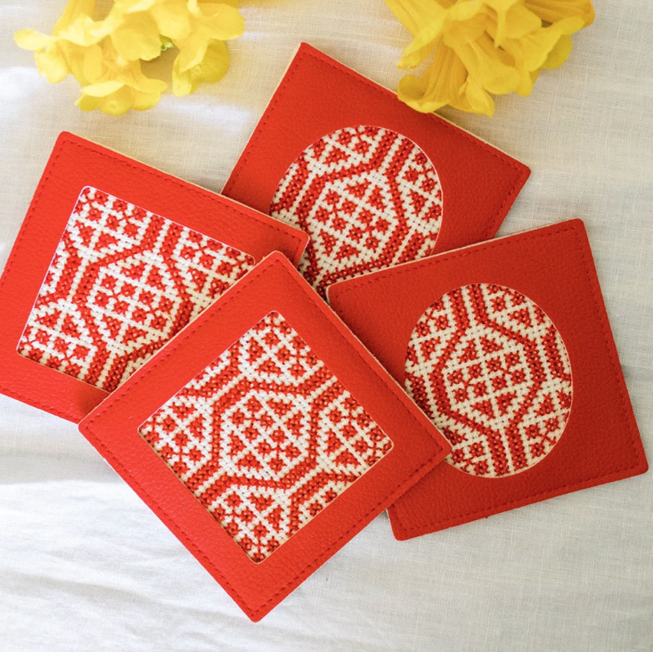 Sold in sets of four (2 square and 2 oval coasters).