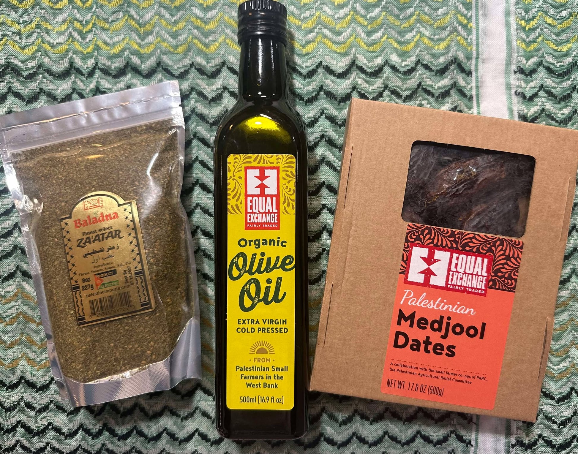 Equal Exchange EV olive oil 500ml, Za'tar 8oz, Gazan Dukkah 8oz, Medjool dates 500g, Wild sage 1oz , Palestinian herbal tea bags (2)