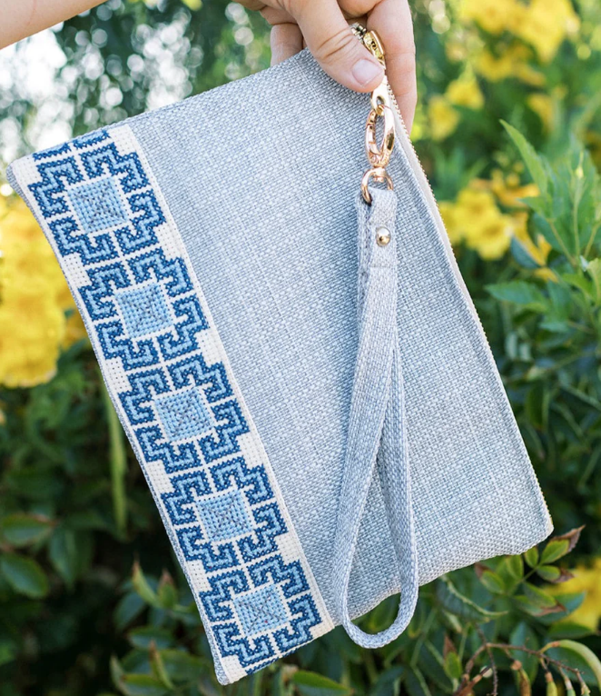Lined with cotton fabric | Zipper closure | Detachable wristlet strap.