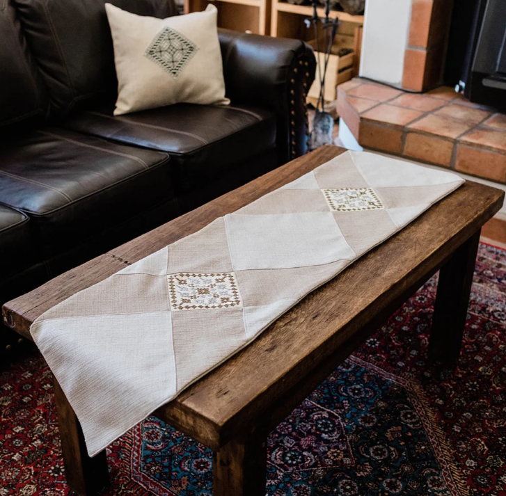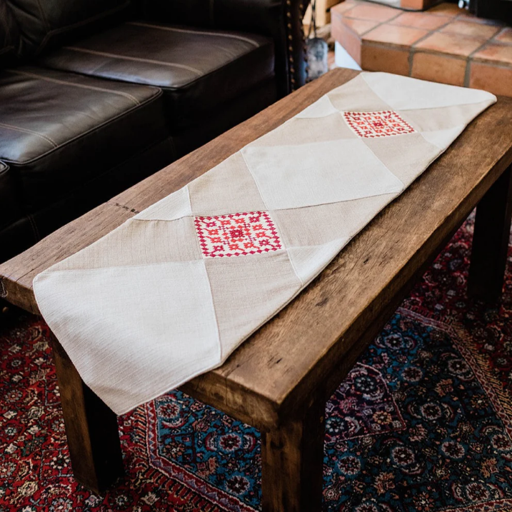 Hand embroidered by refugee and low-income women artisans with a traditional Palestinian tatreez or Tahriri design.