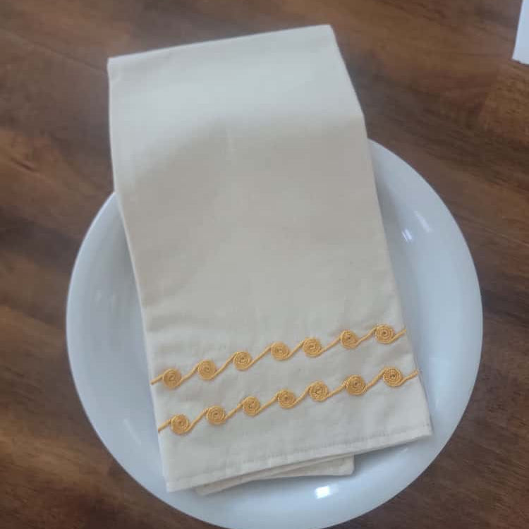 This tea towel features the "Flowers" motif. We are proud to share the traditional art form of Tahriri embroidery with you! As part of our mission to supply ongoing skills training, we are teaching our Darzah artisans this unique Palestinian embroidery style, native to the Bethlehem and Beit Jala region.
