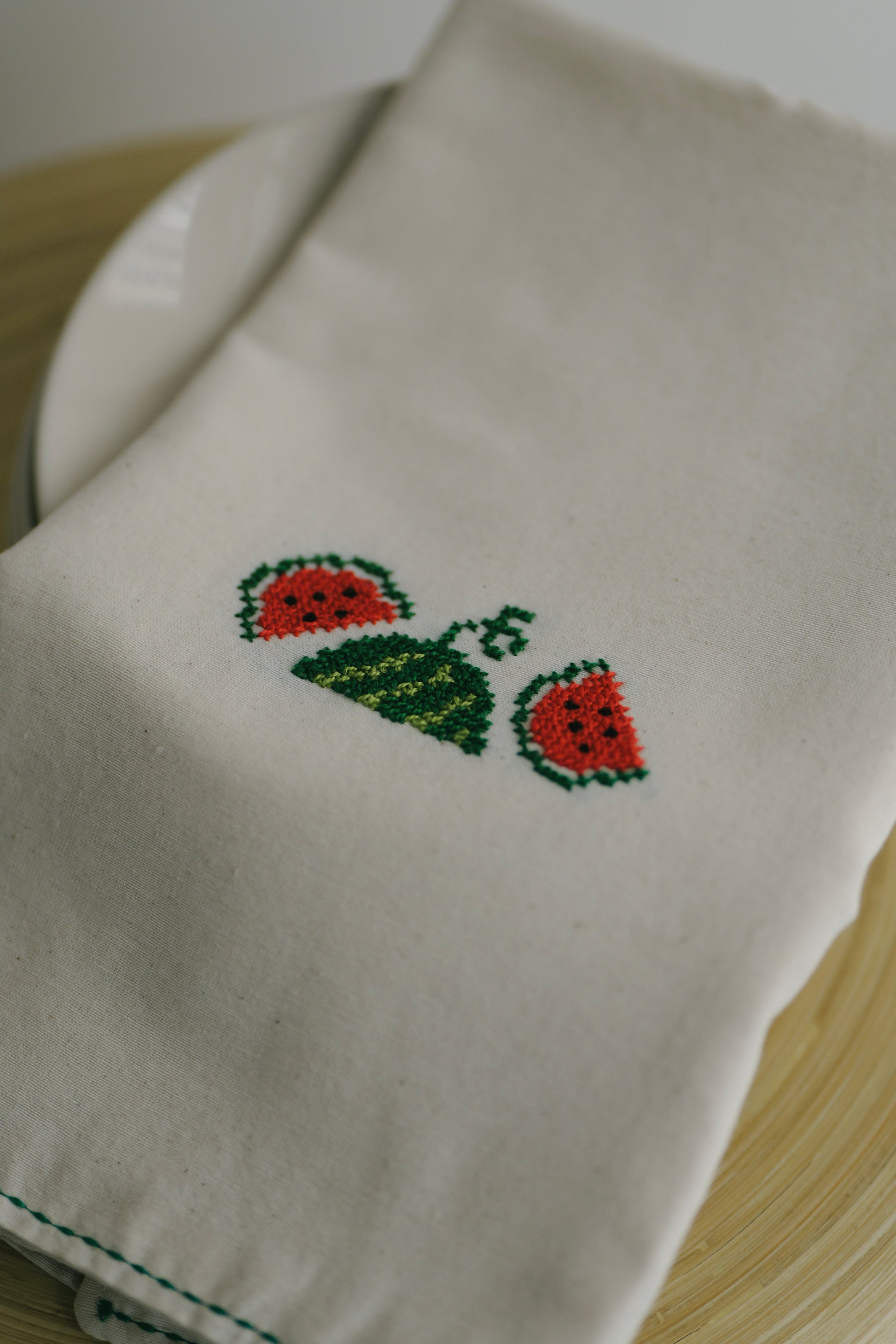 This tea towel features an "Watermelon" tatreez motif. The design takes 2 hours for our Darzah artisans to embroider. Your purchase will support 1/4 of a day's empowering work for a talented woman artisan in Palestine!